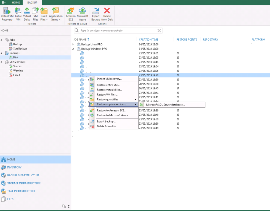 Para lanzar el asistente de restauración debemos de abrir la consola de veeam y dentro de Home→ Backup→Disk seleccionamos la máquina que tiene la copia que queremos restaurar. Sobre la máquina seleccionada pulsamos el botón derecho del ratón Restore application items→ Microsoft SQL Server Database