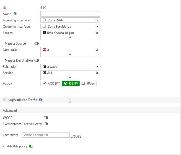 Una vez creada la lista ya sólo necesitamos crear una nueva política usando como dirección está lista para bloquear su acceso