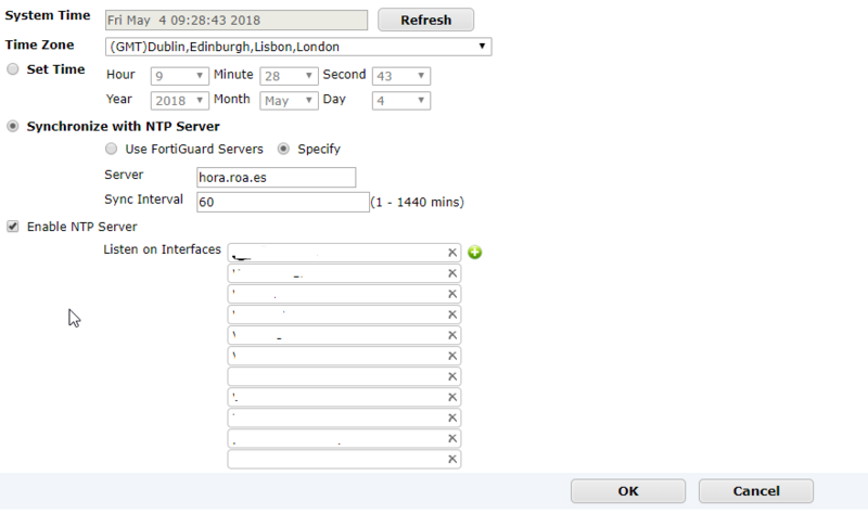 Seleccionamos la opción de sincronizar con un servidor ntp y a su vez habilitamos los interfaces por los que estará disponible el servicio ntp.