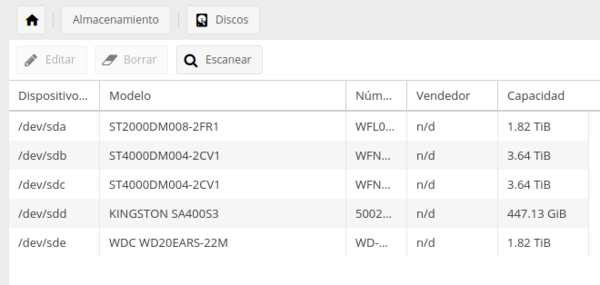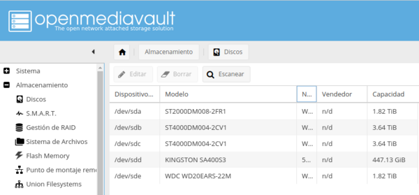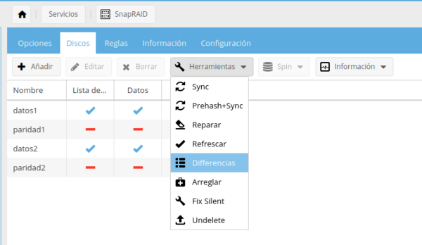 Ahora debemos de ir al OMV → Servicios →Snapraid → Discos