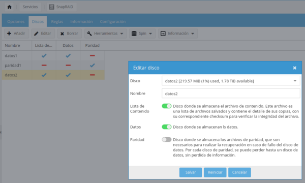 Por último vamos a cambiar el disco datos2 para convertirlo en un disco de paridad. Lo ideal es desmontarlo, formatearlo y volverlo a crear como disco de paridad