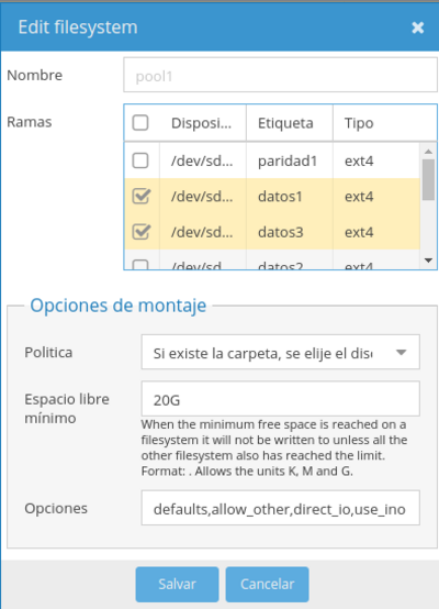 En mi caso como además tengo montado un pool con Unionfilesystems debo de editar el pool para cambiar las particiones asignadas al mismo.
