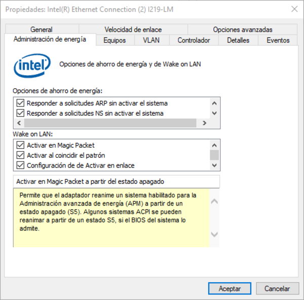 El wake on lan permite que el adaptador de red reanime un sistema en el que tengamos habilitado la Administración avanzada de energía (APM) cuando la conexión de red establece un enlace.