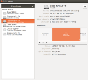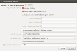 Seleccionar el disco y la partición y pulsar sobre el icono de los engranajes y seleccionar la opción editar las opciones de montaje. Añadimos la opción permissions al final de la línea