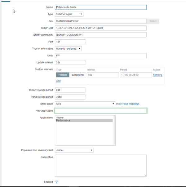 Voy a crear un item llamado potencia de salida para saber el consumo estimado de potencia a la salida de la SAI. Esto además me va a permitir posteriormente crear una gráfica para tener una visualización en el tiempo de la misma.
