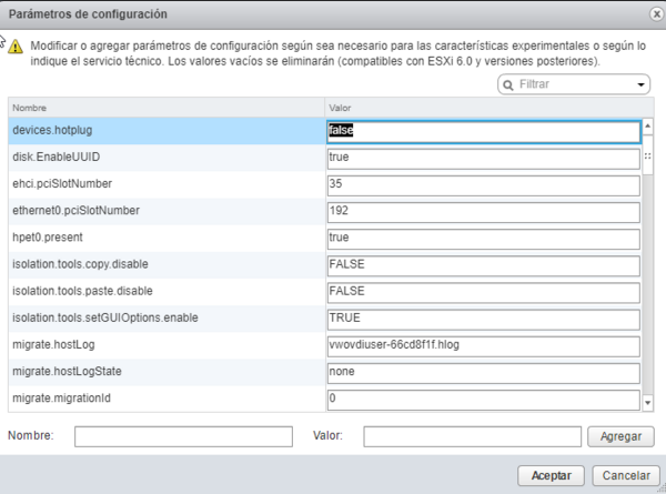 En nombre ponemos devices.hotplug y en Valor ponemos false y pinchamos en el botón agregar