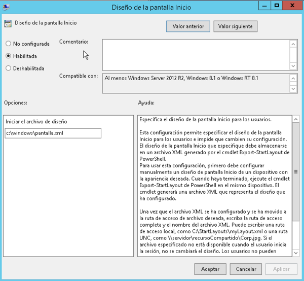 configuración de usuario→ plantillas administrativas → Menú de inicio y barra de tareas → diseño d ela pantalla de inicio →
