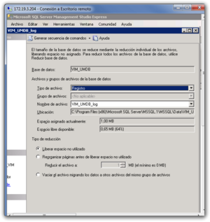 Desde el SQL server Management nos conectamos a las BDD VIM_UMDB y VM_VCDB. Botón derecho sobre la BDD VIM_UMDB→propiedades→opciones. En en modelo de recuperación lo cambiamos de full a simple y pulsamos aceptar