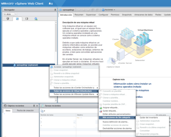 - Desde el propio vcenter pinchandobotón derecho sobre la mv huérfana → todas las acciones de la Virtual Infrastructure→Más acciones de sin categoría→quitar del inventario