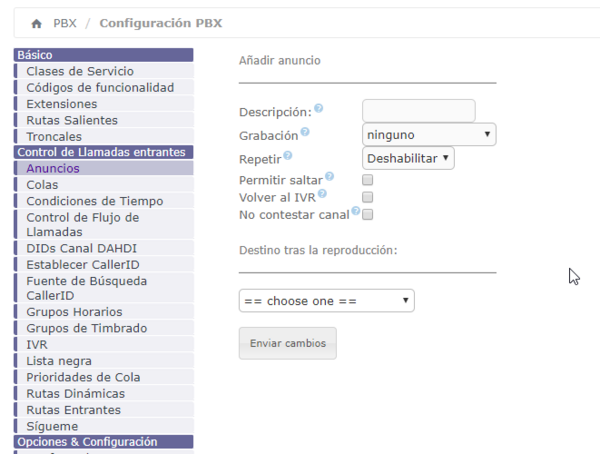 Para crear un nuevo anuncio tenemos que pinchar desde la interfaz web en PBX→Configuración PBX→Anuncios