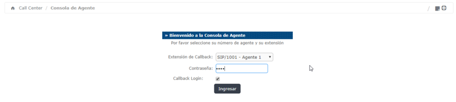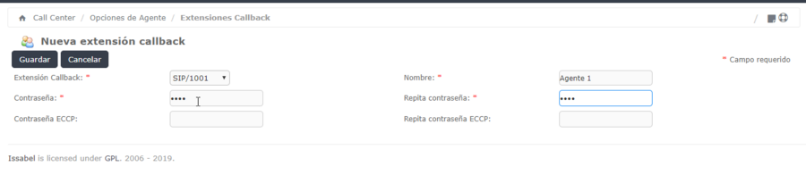 Call Center→ Opciones de Agente → Extensiones CallBack→Nueva Extensión callback Seleccionamos la Extensión, le asignamos un nombre,una contraseña númerica y guardamos